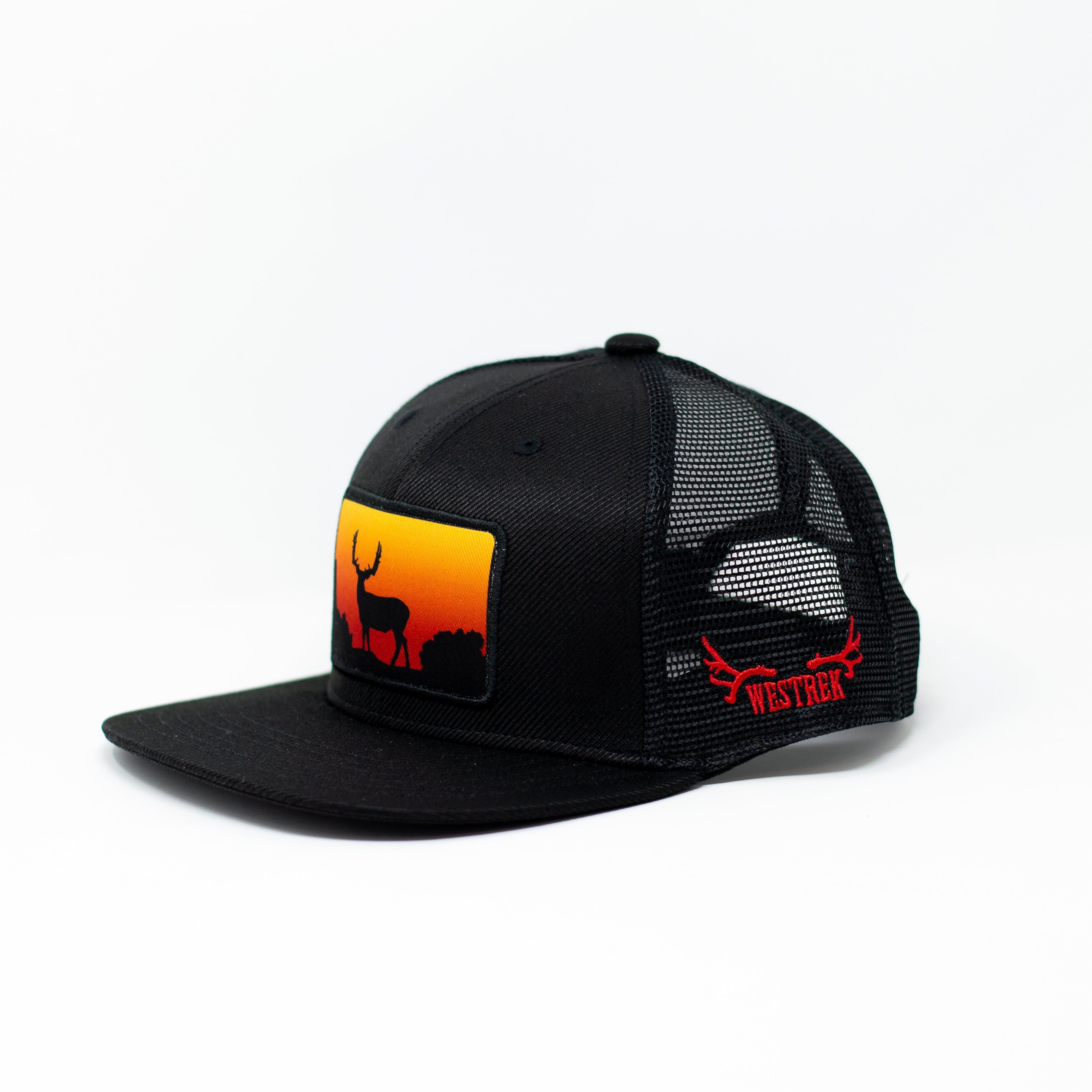 Black youth size hat. Sunset mule deer design. Mesh snapback.