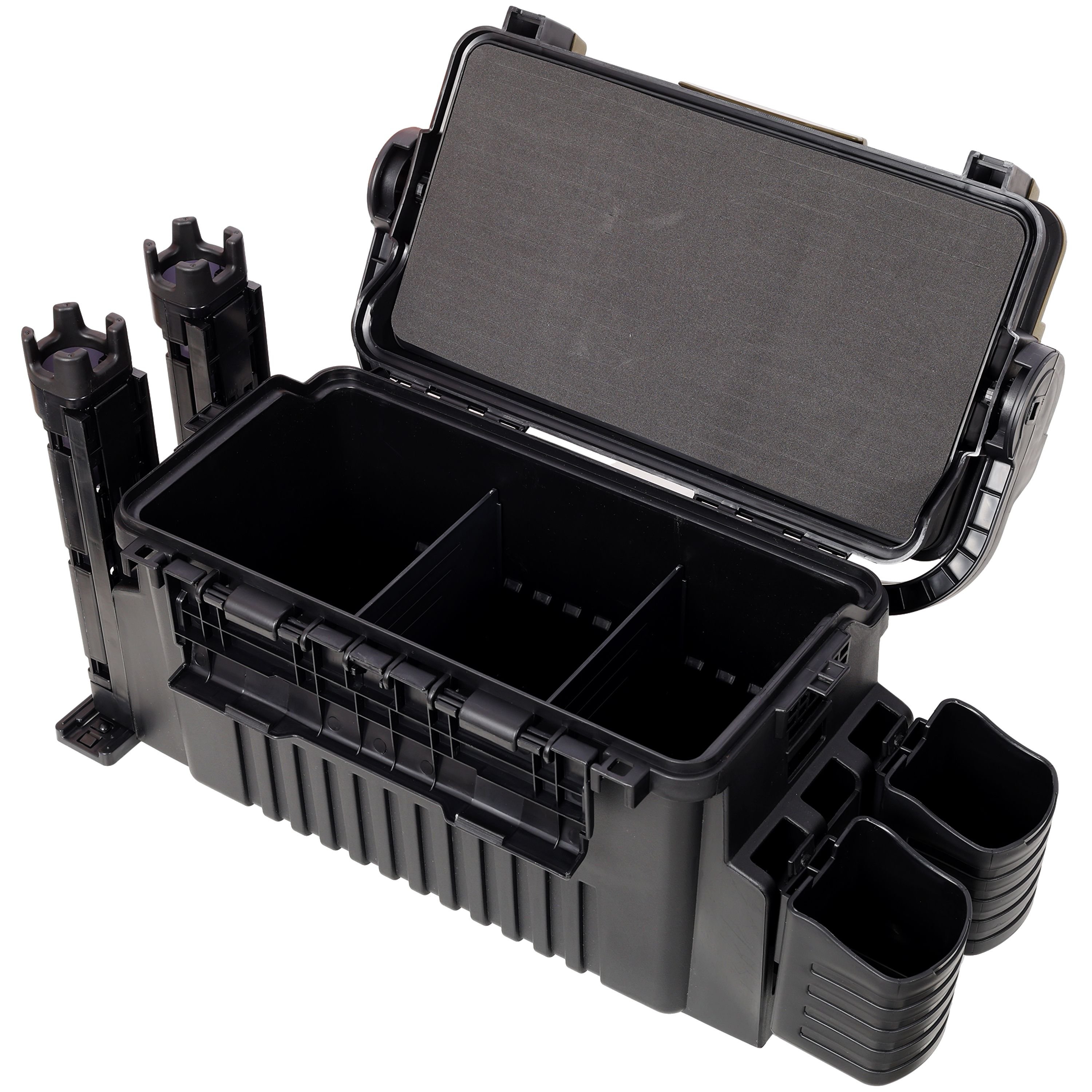 Tackle Box Large: Comes with 1pc 2 layer fishing tackle box, inside with additional accessories - 1pc carrying strap, 2pcs black cup holders, 2pcs black rod rack holders with split structure.