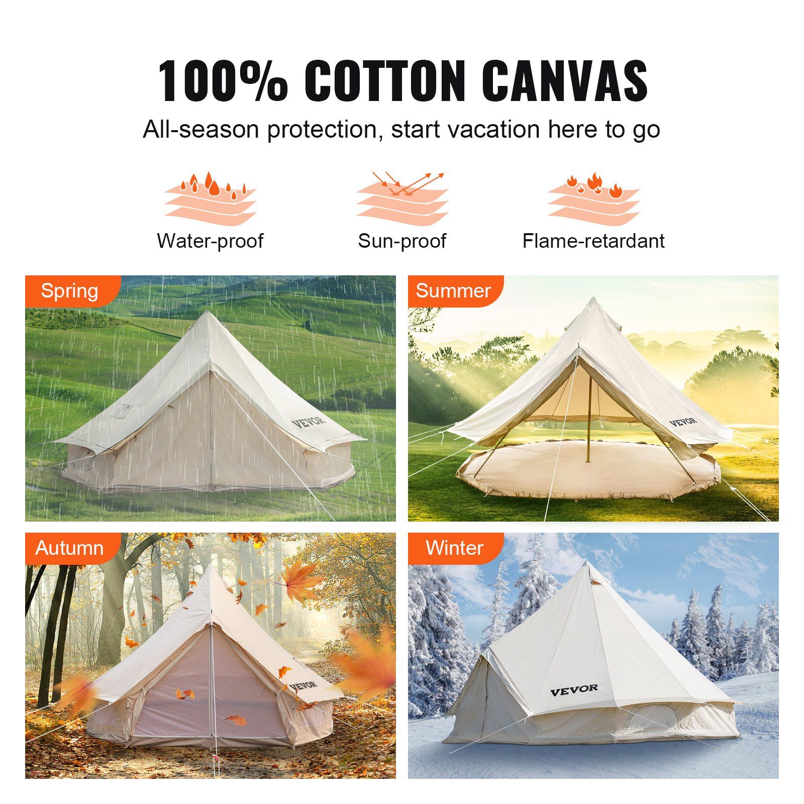 This 4-season waterproof bell tent is made of a 300gsm cotton canvas, which is sturdy and lightweight. Additionally, it is large enough for 3-5 people to sleep and firm enough against stormy weather. A stove jack is designed for winter, and complete accessories are included for easy setup. Thus, our tent is perfect for camping, hiking, backpacking, trekking, mountaineering, etc.