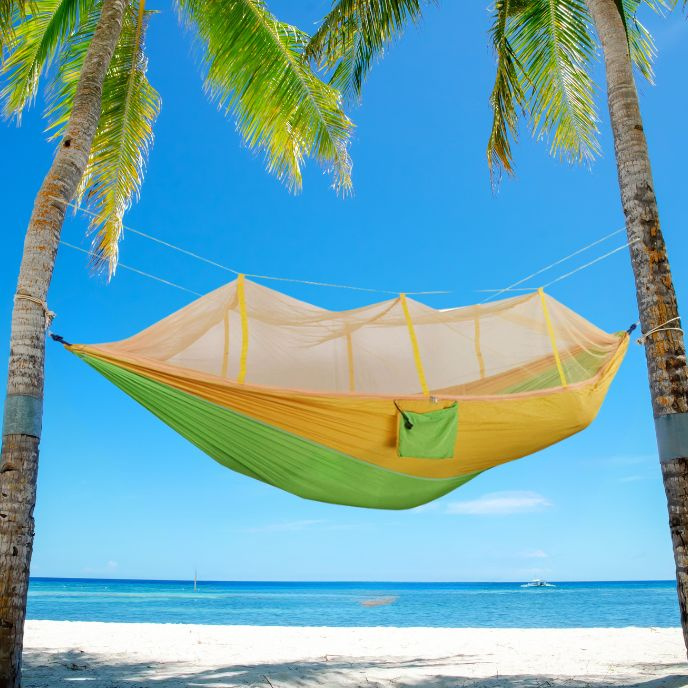 Seamless Outdoor Sleeping Hammock With Mosquito NetHammock Material: 210D nylon fabric (Parachute cloth)Mesh Material: High-Density NetSpecifications:  102in × 55.18inNet Weight: (1.43lb)Maximum Support Weight: 660lbs (300kg)Accessories:2m strap × 24m draw rope × 2Color Options: 14 colors availableApplicable Scenarios: Picnics, outings, camping, etc.Features:High-Quality Mesh Protection: High-density mesh prevents mosquitoes from entering, ensuring a comfortable and breathable outdoor experience.Easy Setup: Simple strap and rope installation allows for quick setup between trees.Lightweight & Portable: Weighing only 650g (1.4lb), it’s easy to carry for camping, hiking, and beach trips without adding bulk.Adjustable Strap System: Standard 2m strap allows for flexible tree distance adjustments, enhancing convenience.User-Friendly Installation: Mosquito net design enables hassle-free setup—just wrap the straps around trees, tighten, and enjoy.